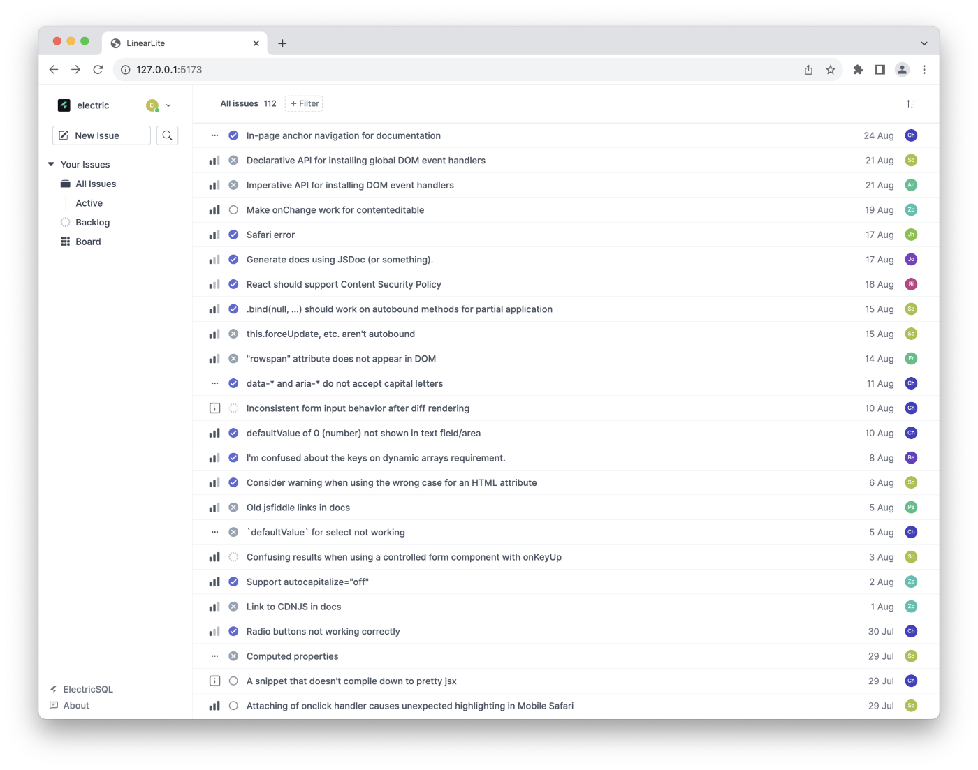 Recently at Electric we’ve been building some demo apps; this is both to demonstrate the capability and use of Electric as platform, and to help inform our design process. The first of these demos is what we’re calling “Linearlite” - a simplified, lightweight clone of the Linear project management and issue tracking tool. It uses the standard ElectricSQL architecture of Postgres on the server, SQLite in the browser, and Electric’s sync layer in the middle.