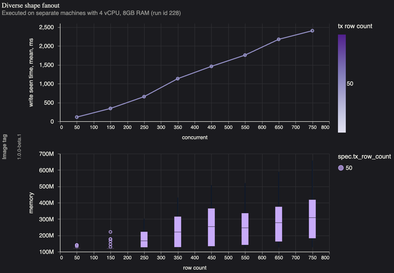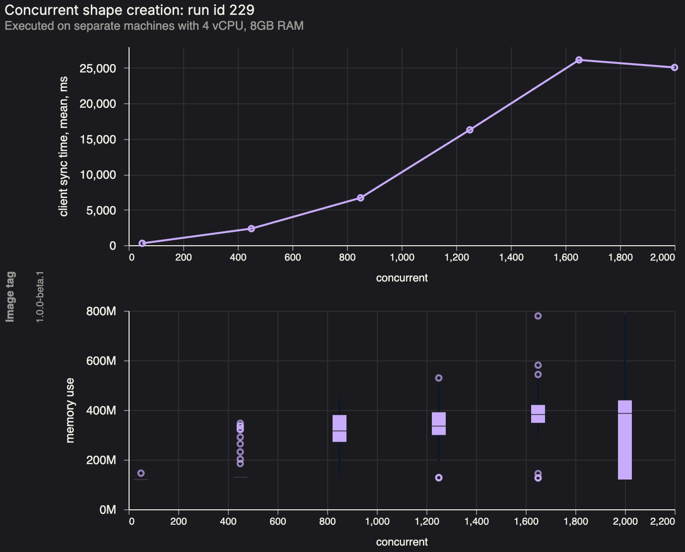 Our goals are to support millions of concurrent users, hundreds of thousands of shapes and high read and write throughput from a single Electric instance, with minimal impact on the source Postgres. With low, stable and predictable compute and memory usage. In order to work towards this, we use benchmarks internally to measure and inform work to improve performance.