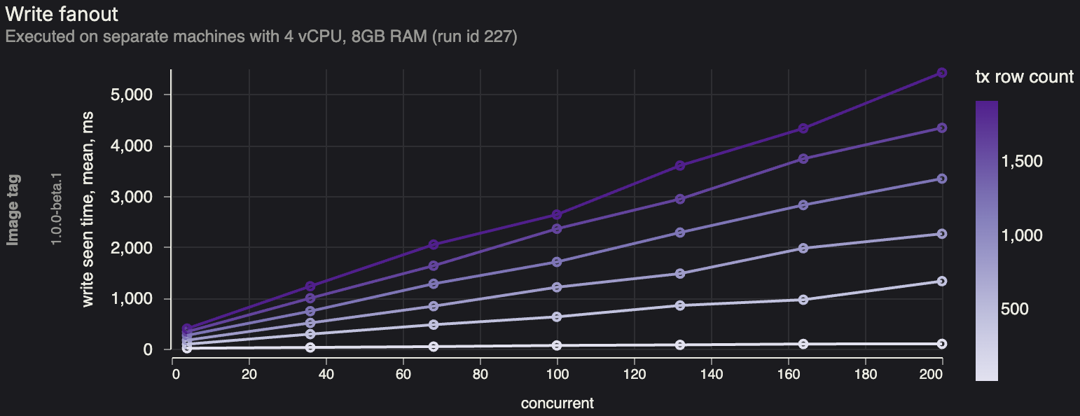 Measures write latency (i.e.: time for the client to see the write) for a transaction of increasing size written to one shape log, streamed to an increasing number of clients.